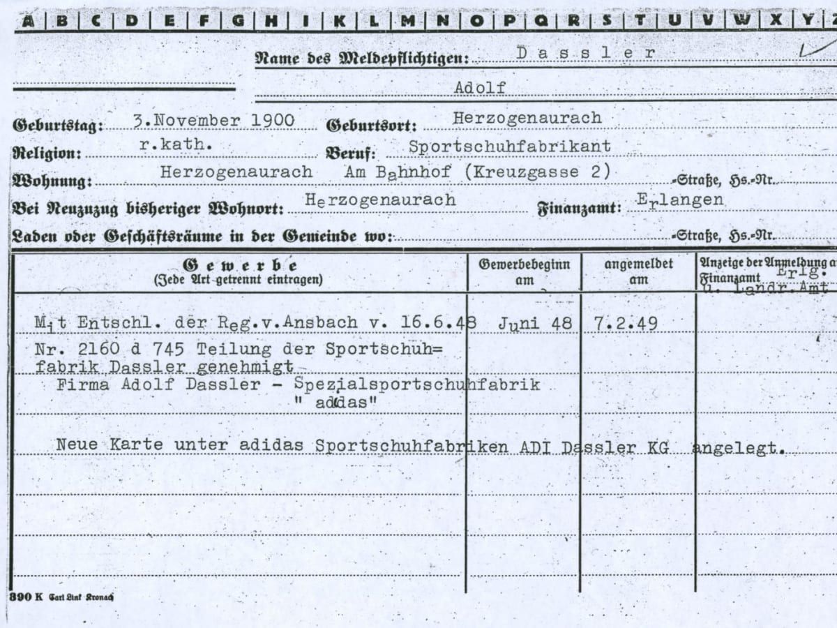 Початкова назва компанії була Adolf Dassler Adidas Sportschuhfabrik. Її було зареєстровано 18 серпня 1949 року.