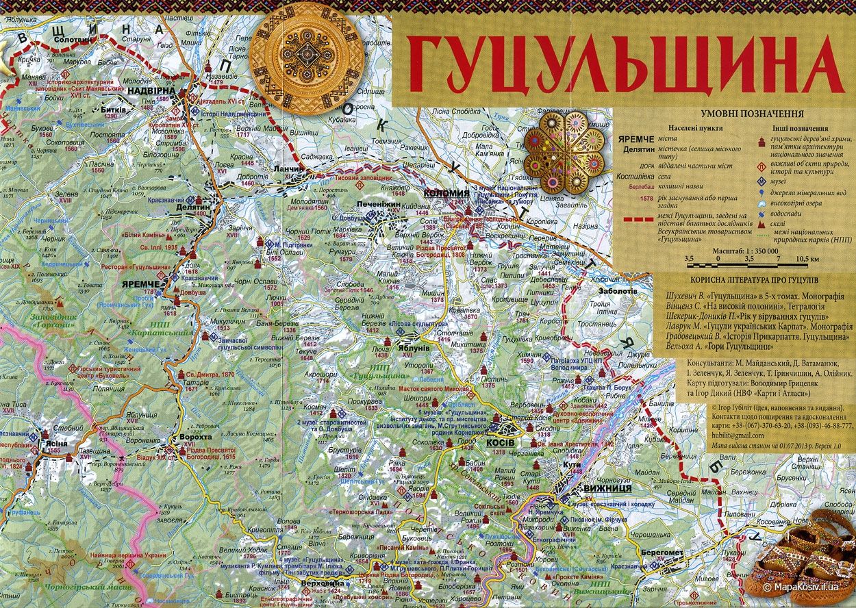 Территория, где проживают гуцулы / Скриншот путеводителя "Гуцульщина" (идея и издание Игорь Губилит, Львов, 2014 год), взято с сайта "МапаКосив"