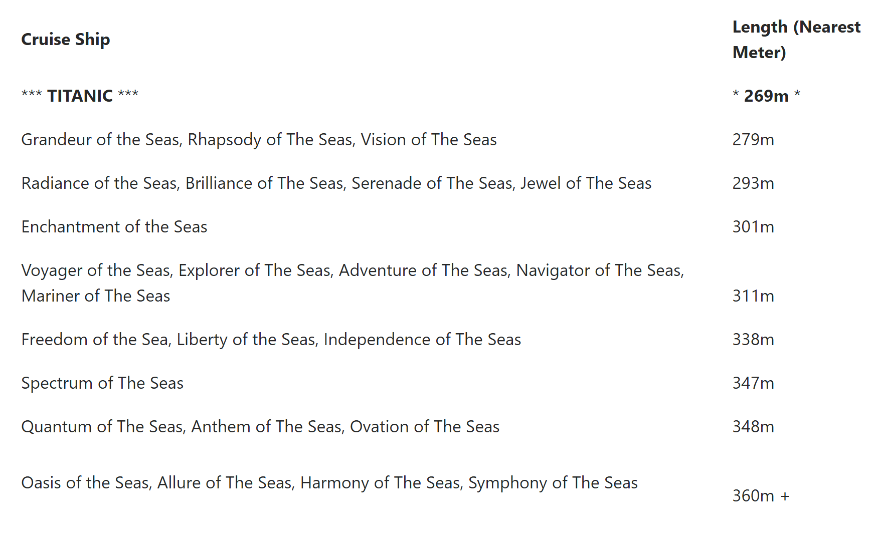 Сравнение "Титаника" по длине с крупнейшими круизными лайнерами в мире от Royal Caribbean / Скриншот