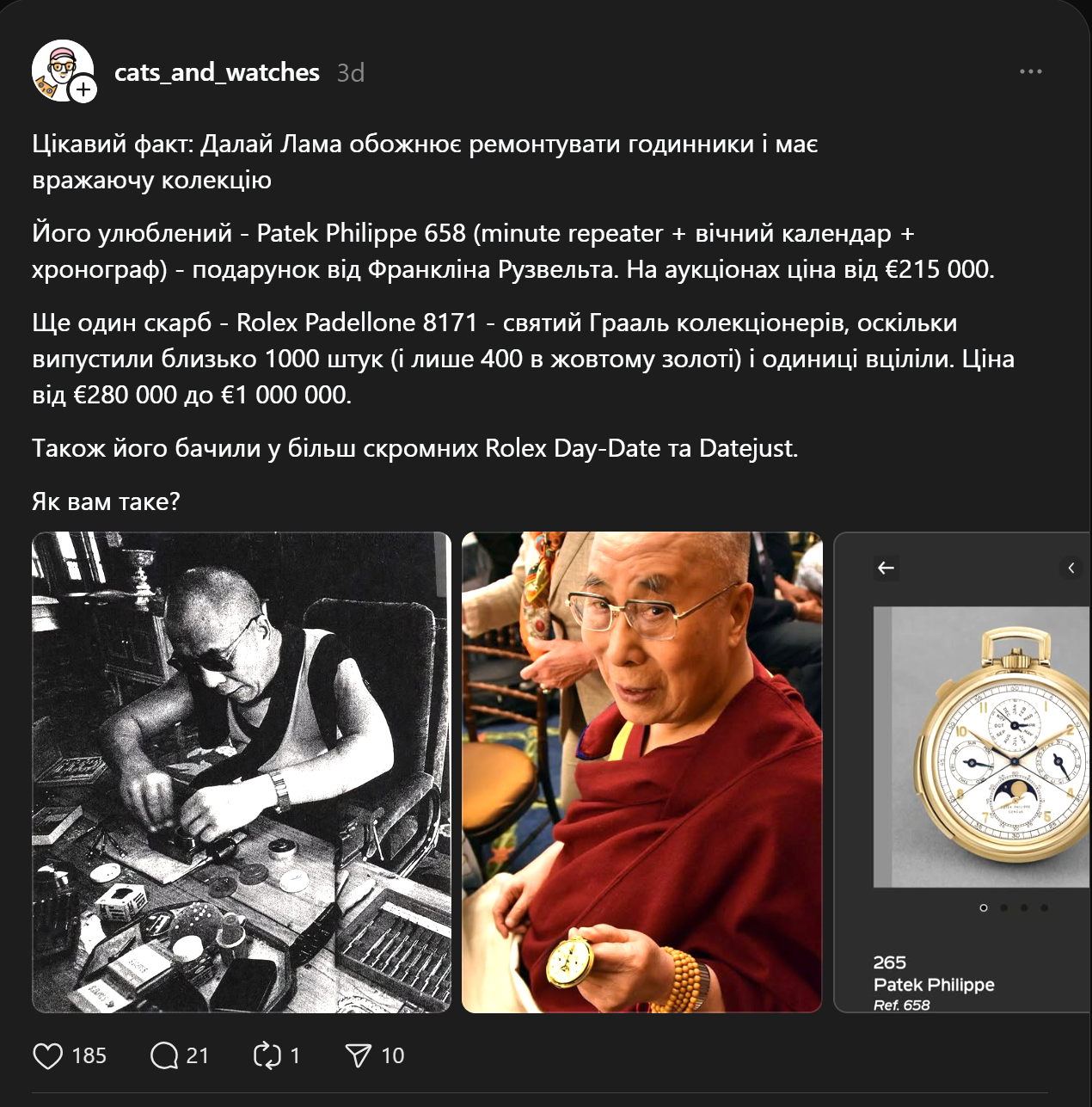Далай-лама не лише обожнює годинники, а і любить їх ремонтувати / Скриншот допису cats_and_watches